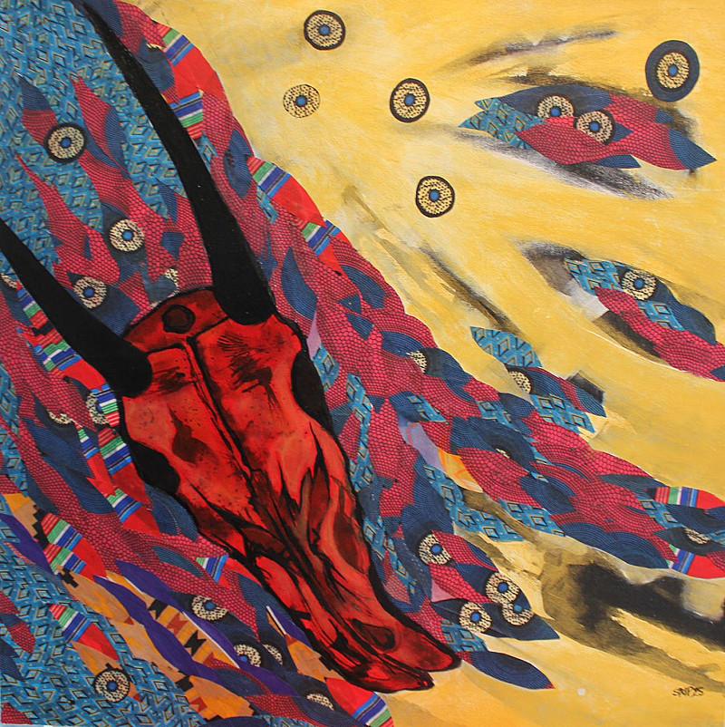 My work on this exhibition talks about the changes in Africa, the blending of cultures and the dystopian and utopian elements in my country and continent. I  incorporate expressive shapes and patterns in my work and find myself drawn to the provocative colours and decorative images of ethnic African art. I see Africa oscillating between two worlds: the beautiful wildlife and landscapes and the modernised, often struggling or dysfunctional systems. Although continuously conflicted with the fact that I am apart and part of Africa at the same time, I find Africa deeply beautiful. My work depicts its unstoppable changing and diverseness.