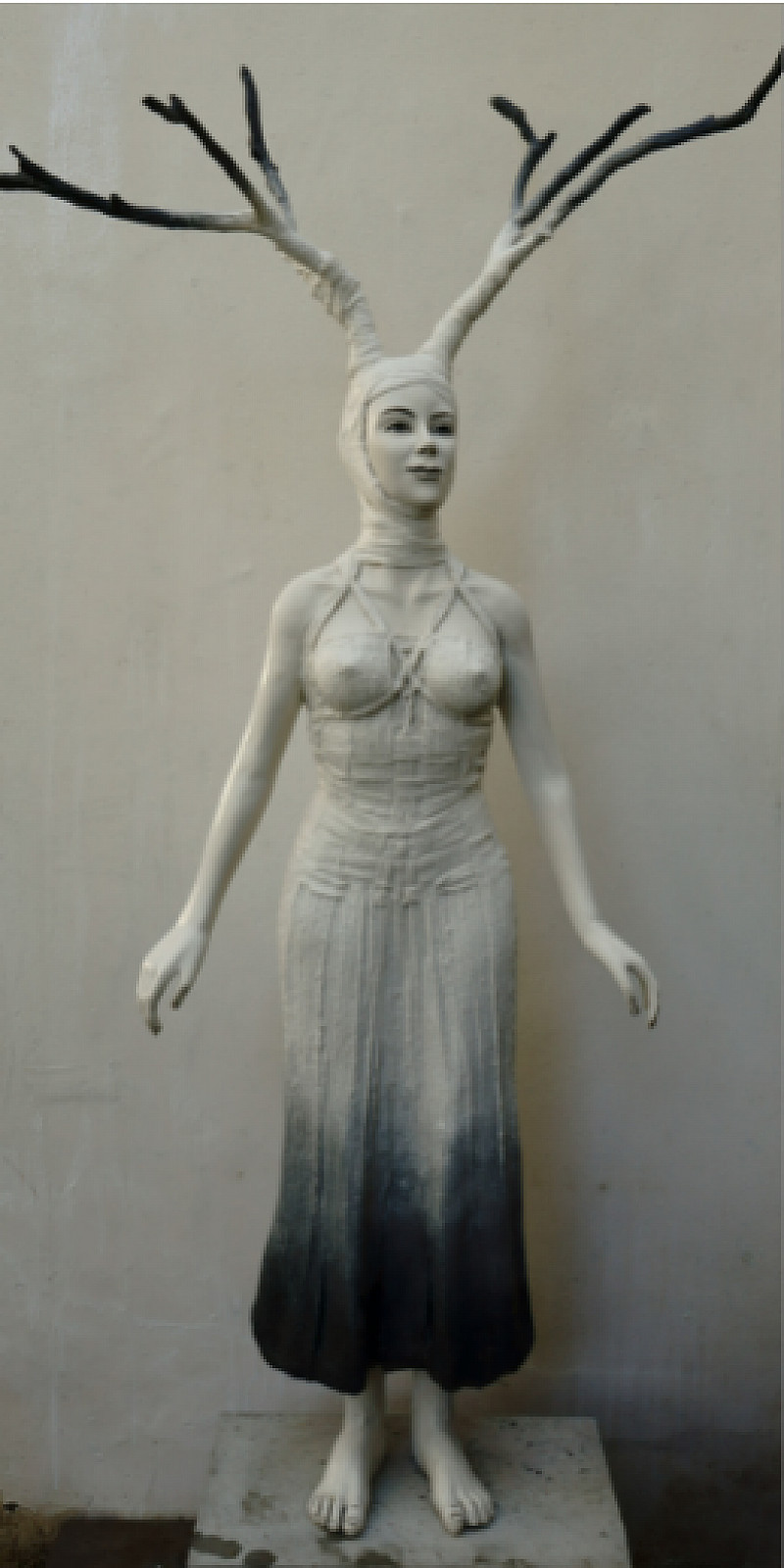 "Artemis" is a strong female figure and protector of Nature in Grecian Mythology. Her dress is woven from bandages, suggesting her role as healer. I often notice birds from my garden, perching in her branches as if they know that it's a sanctuary for them.