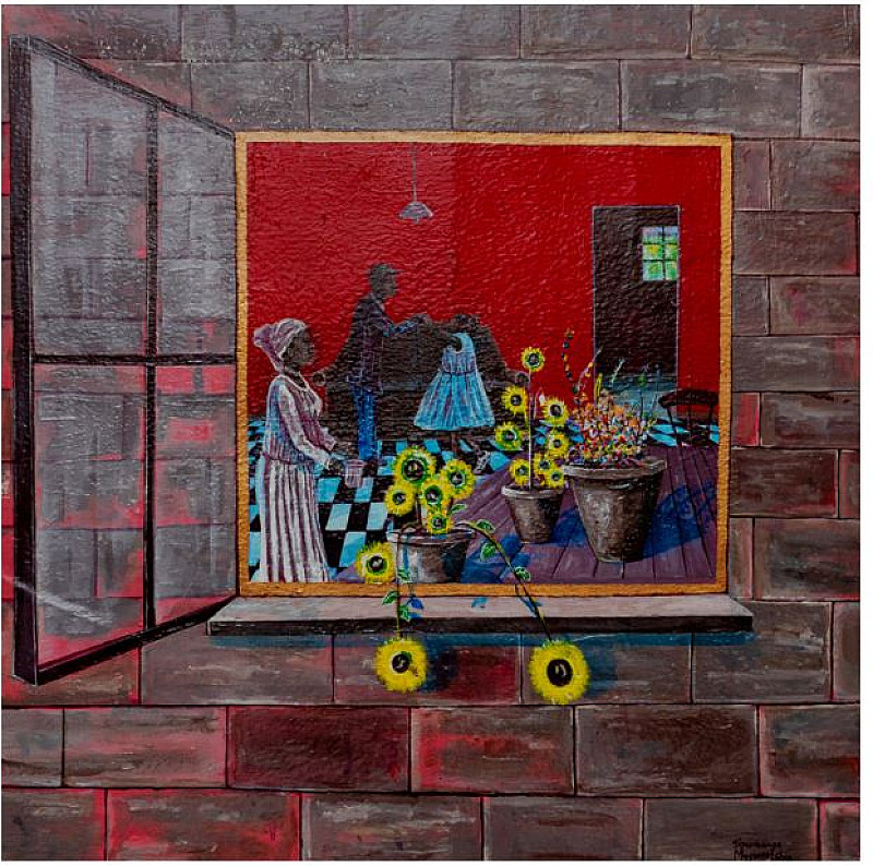 This painting is a poetic meditation on resilience, growth, and the interplay between beauty and struggle. It situates flowers symbols of fragility and strength within a domestic yet charged space linking them to broader societal themes. A women stands near a table by the window adorned with sunflowers and other blossoms , poised to water them. This simple act of care becomes profound nurturing life in a world of uncertainty. The open window allows fresh air and light to come in an invitation for change. In the background a father and child dance, a tender yet power ful moment joy amidst the structured setting. The necessity of finding joy even in turbulent times . This painting invites reflection on how flowers , of ten seen as mere decoration, can symbolize resi stance, trans format ion and human connections.