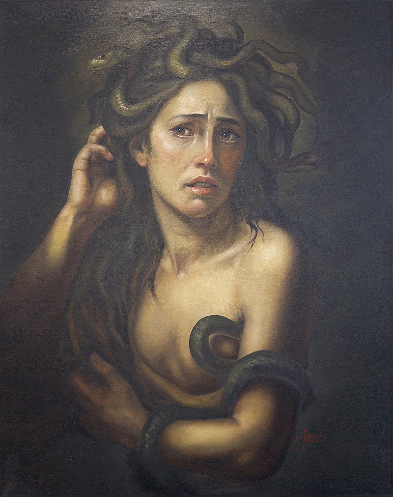 In the moment of transformation, Medusa ceases to be mortal and becomes eternal. The painting captures the threshold where fear turns into legend.