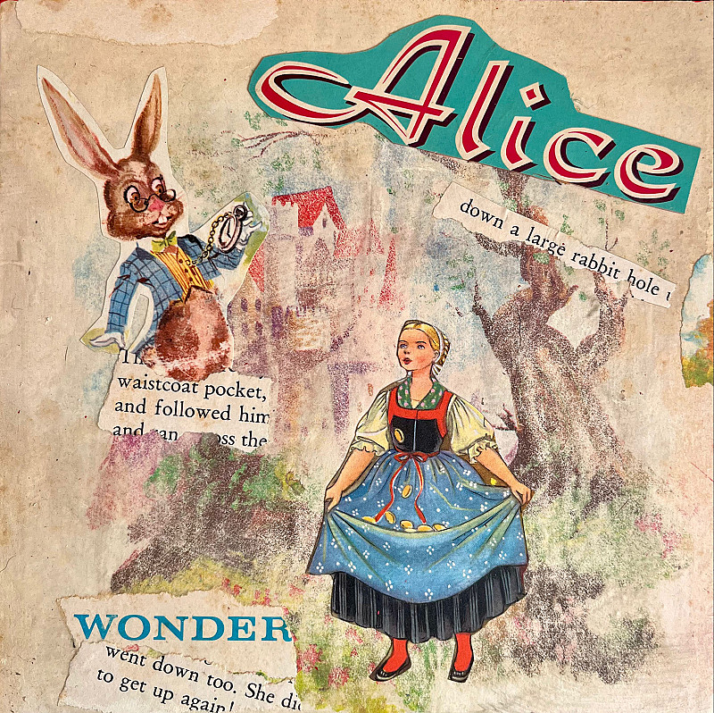 , Thelma van Rensburg , Collage and acrylic from vintage books on wooden canvas