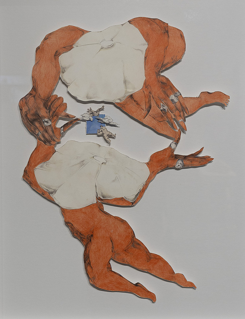 Opposite this suspended architecture is the terrain of the body. The figures, twisting and