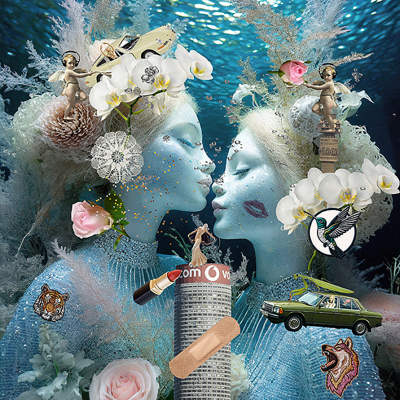 THE ARTWORKS ARE BLUE MANNEQUIN DOLLS REPRESENTING THE "AI", THE COLLAGE WORK IS HUMAN ELEMENTS INTERACTING WITH THE DOLLS AS IF THEY ARE THE HUMAN ELEMENTS THAT THE AI OR IT WISHES IT WAS. THERE IS A LAYER OF DIGITAL COLLAGE AND A LAYER OF PHYSICAL COLLAGE ELEMENTS.