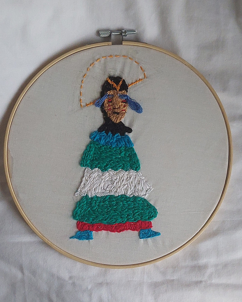 Making visible lines, and transmitting my energy in the fabric, I used an embroidery ring to highlight each scene. I listened deeply to the textual voice; selecting coloured yarn intuitively, following the motions of the sharp needle through the fabric.