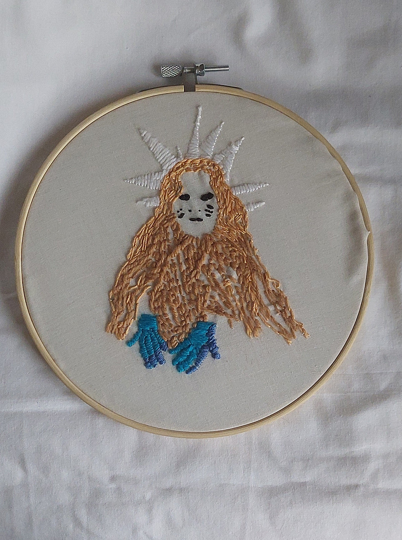 Making visible lines, and transmitting my energy in the fabric, I used an embroidery ring to highlight each scene. I listened deeply to the textual voice; selecting coloured yarn intuitively, following the motions of the sharp needle through the fabric.