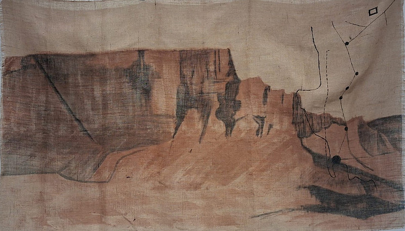 Ink, bitumen and ubomvu on hessien