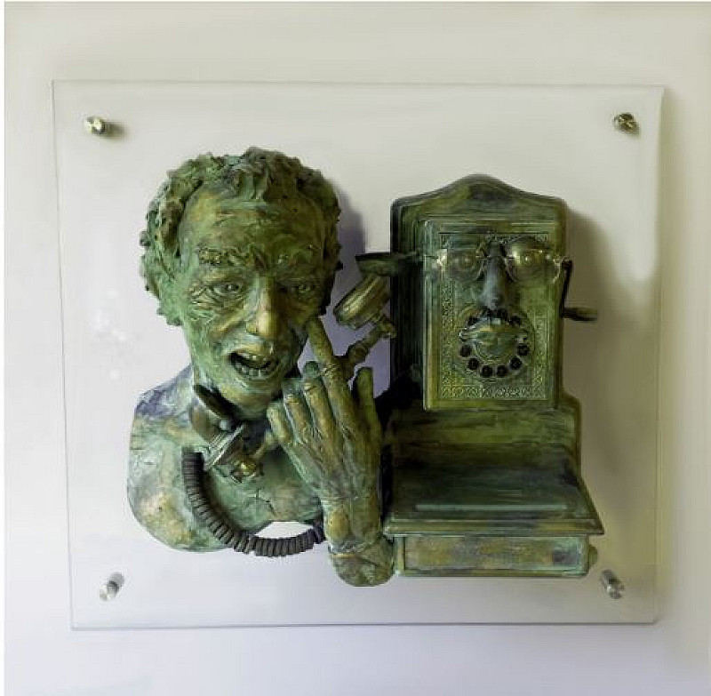 In this sculpture, I utilize the classic design of an old vintage telephone to make a statement against modern technology that evokes a sense that we are constantly being watched and listened to, leading to an invasion of our personal space.