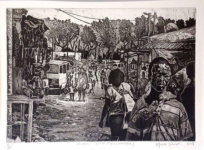 "Since I was a child in Mozambique I knew that I wanted to be an artist. Growing up, I experienced art by joining other groups of artists. My work at that time wasn’t of a good standard. When I moved to South Africa, almost 10 years ago now, my work has developed and gone through many changes and transitions. My work is largely about the life and perspective of people in Mozambique and South Africa. Since graduating from Artist Proof Studio, I have produced numerous etchings on steel plates, and each time I explore new aspects of intaglio techniques. This is a constant and intense process of discovery and experimentation. In my work, I have begun to challenge the scale and depth of the images through printing on a large scale and joining plates to make up landscapes and cityscapes that engulf the viewer. In these works, perspective and depth are explored and emphasised."