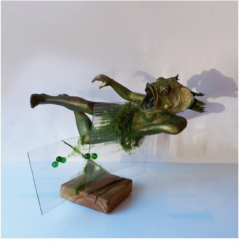 The sculpture captures the impact of human activities on ocean life. The incorporation of the human element, represented by the figure with the fish head, portrays the aggression and abuse suffered by marine life.