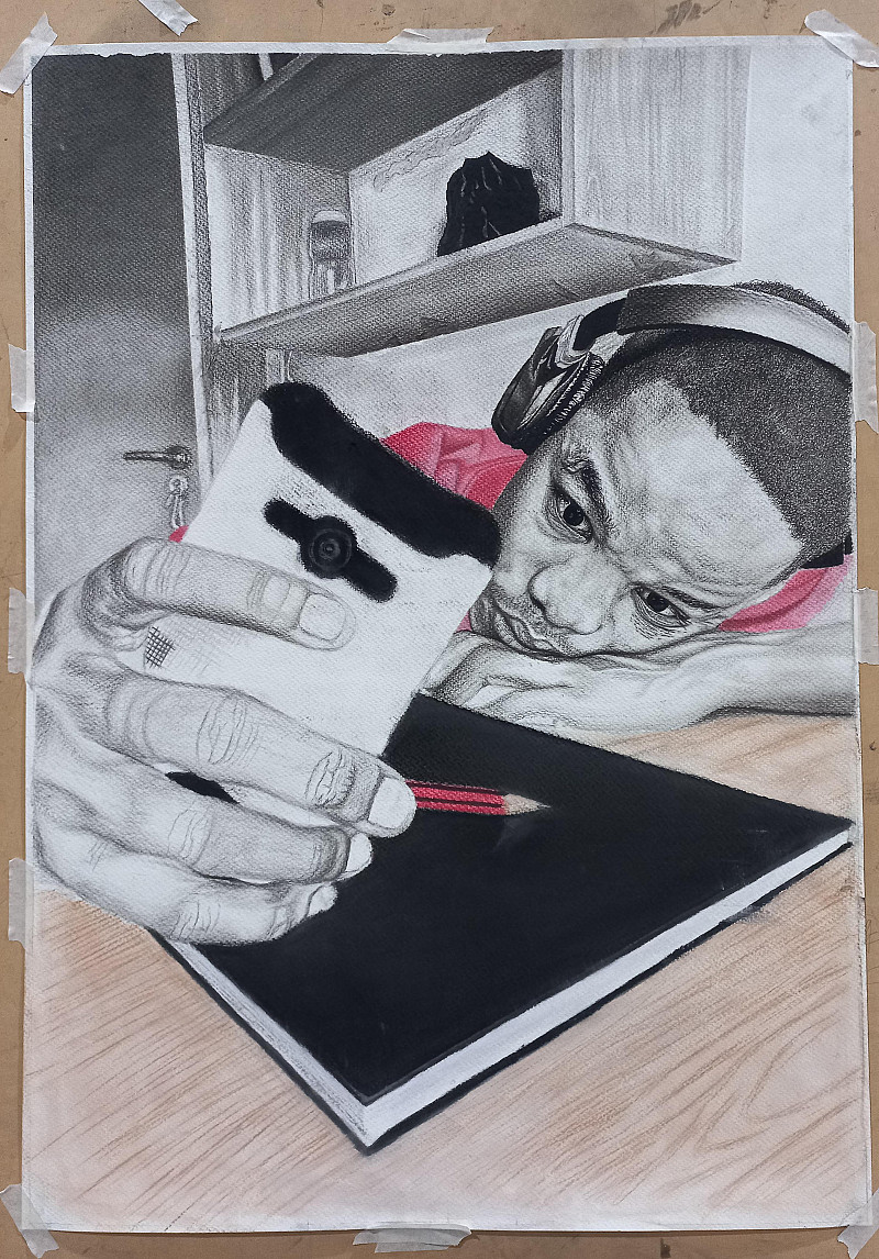 My work explores themes of connection, disconnection, and how people balance presence in the modern world. In my drawing, I show a figure distracted by a phone while holding a pencil, which reflects how technology can interfere with creativity, focus, and real human interaction. It speaks about the struggle between being present in the moment and being consumed by digital spaces.