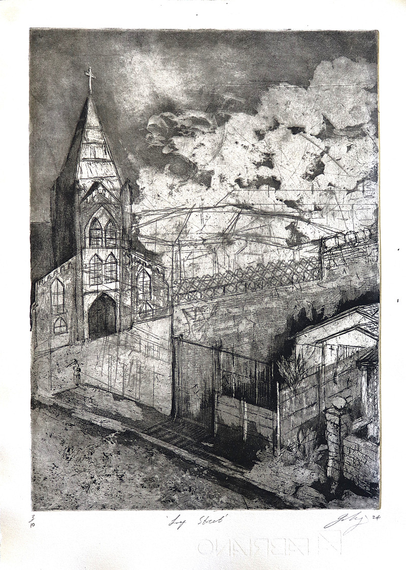 Printmaking depends on ideas of trace, layering and mark-making, making them suitable vessels for conveying these concepts. To me, mark-making plays the role of a record keeper; each mark in the print forever changes what the matrix can produce. This idea of record keeping can be seen in my work. They are bereft of people but are unmistakably lived in. Inhabiting space, as with mark-making, requires prioritizing what to preserve and what is left to decay. Preservation, neglect, and land have an especially complex relationship in South Africa. The Apartheid government’s deliberate neglect of the needs of Black South Africans left indelible marks on our everyday spaces. These marks are found next to those we carve every day. A clean steeple overlooks a dirty street; the laundry is drying, while your books collect dust. These marks come together into recognizable forms to be greater than their parts. In the same way, individual and societal histories come together in significant or banal forms. If you focus on individual marks or layers, you fail to see the merits of the whole. Accepting the present as it is, as the sum of histories, allows us to appreciate its quaint ugliness.