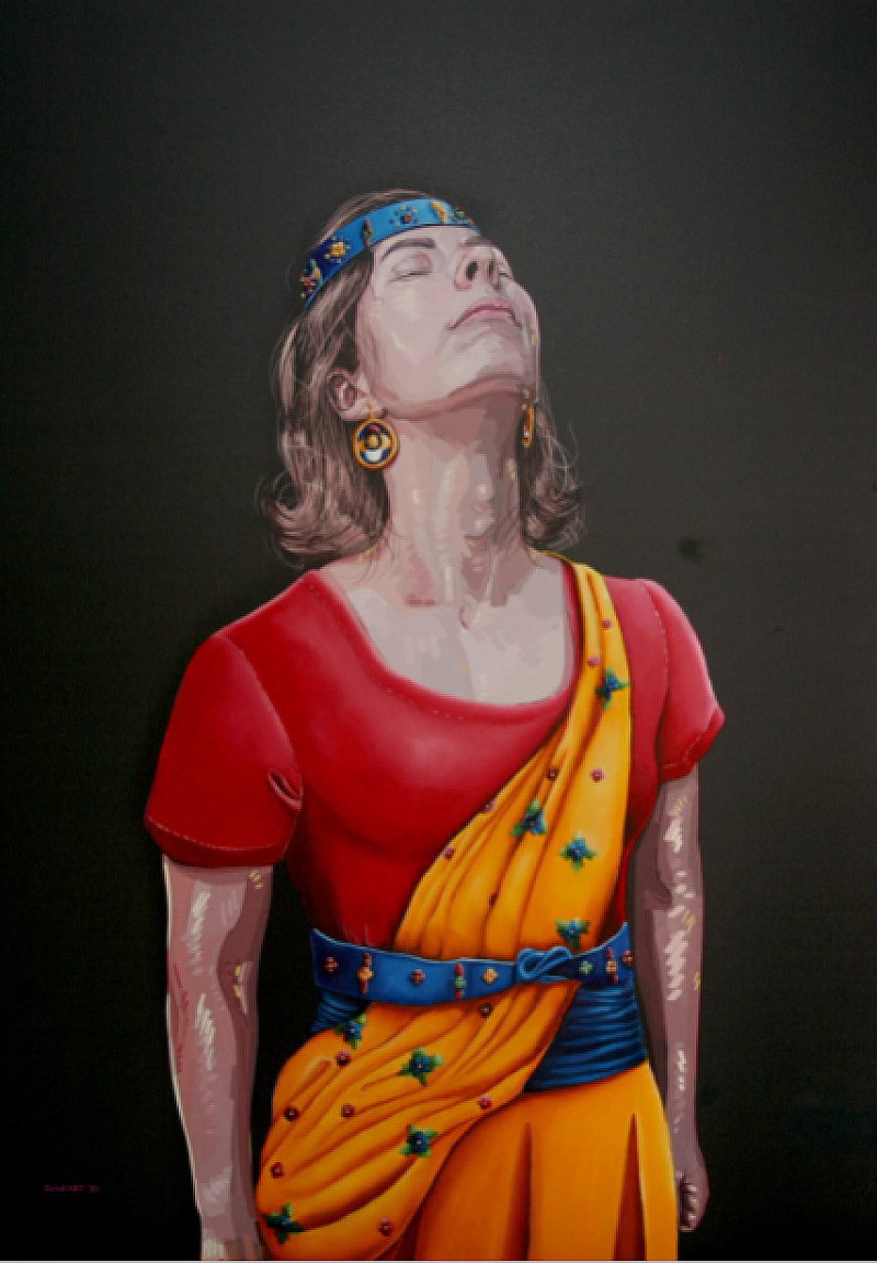 In my series I use a digital medium as well as traditional oil paint to signify the stark contrast of a white skin adorned in the most intricate traditional fashion of various ethnic groups which, by most of the younger black generation, is claimed to be cultural appropriation. I know that with any good intention, I will offend many and will be accused of cultural appropriation, even though I did my research and I truly tried to immerse myself in the history of each ethnic groups traditional clothing. I will always fall short and will always bear the reminder that no amount of appreciation for the traditional clothing or each culture will remove me from being labeled as an ignorant, uneducated, and racist person by my peers.