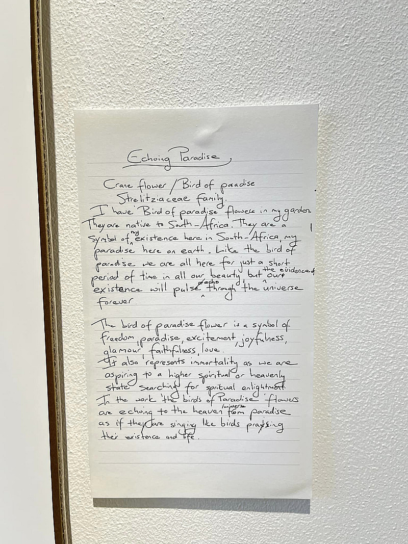 The bird of paradise flower is a symbol of freedom, paradise, excitement, joyfulness, glamour, faithfulness, and love. It also represents immortality as we are aspiring to higher spirituality or heavenly state, searching for spiritual enlightenment. In the work ‘the birds of paradise’, flowers are echoing to the heaven and universe from paradise, as if they are singing like birds praising their existence and life.