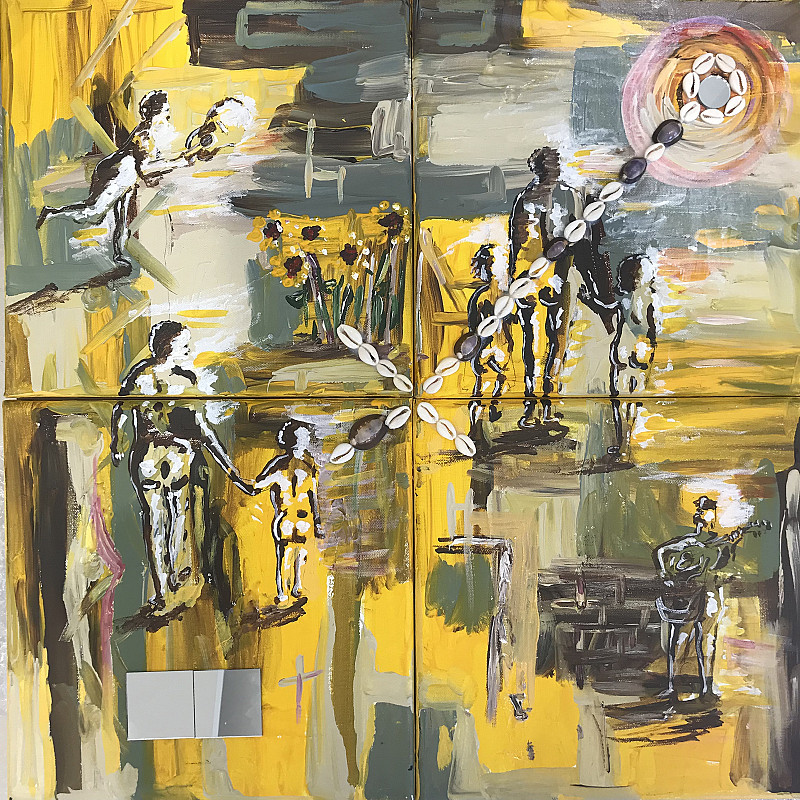 • Acrylic on canvass, glass mirrors and cowrie shells