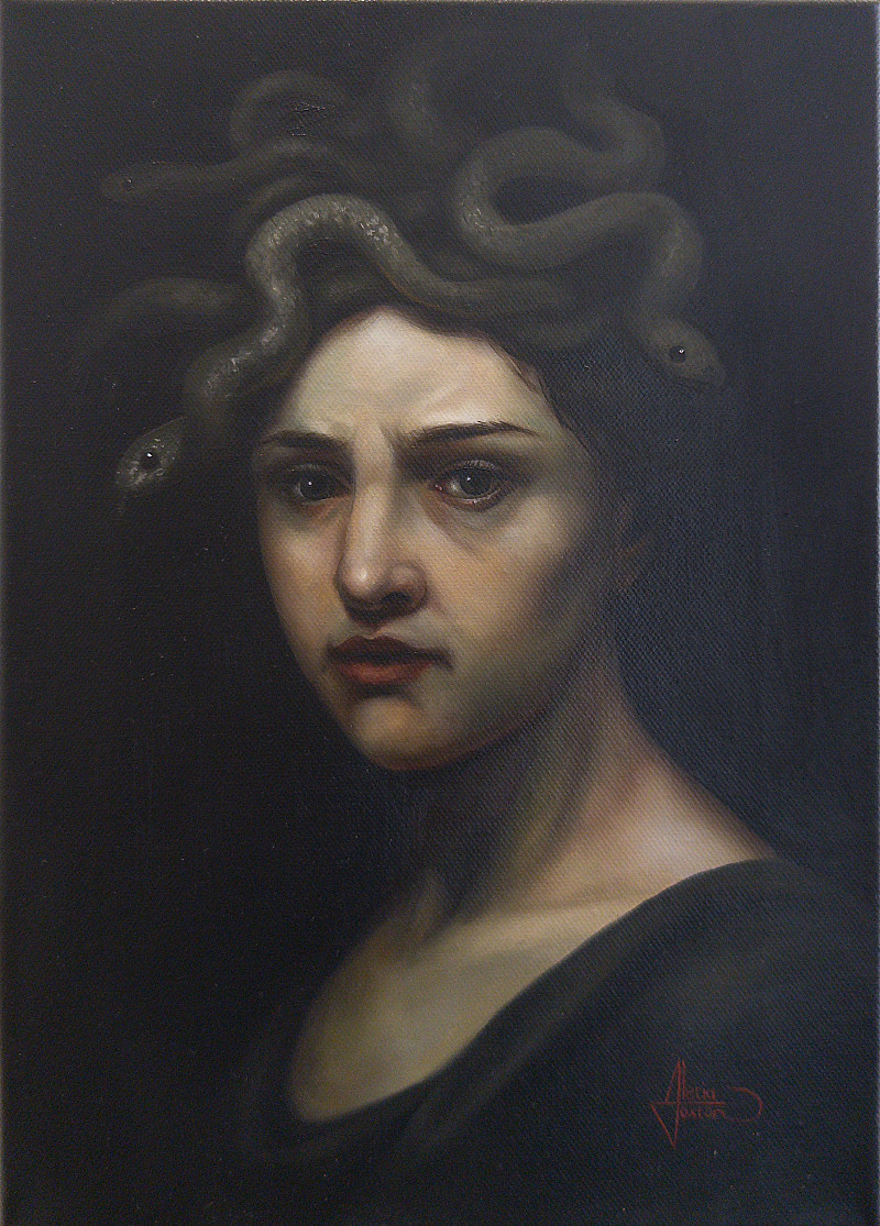 A portrait that restores Medusa’s humanity. No longer only the monster of legend, she is seen as a woman marked by sorrow and memory.
