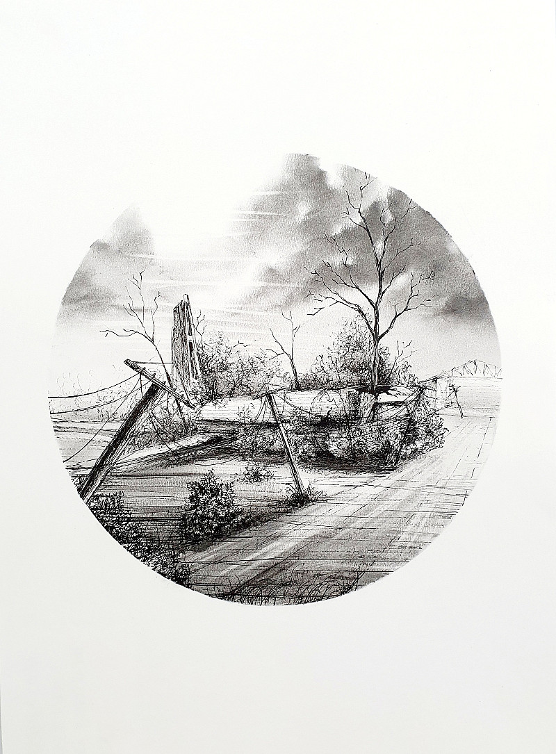 The Abandoned Series portrays the result of human neglect while also highlighting the beauty that can emerge from objects in the process of decay. The Peephole Series invites the viewer to draw closer and explore the fine details within the linework of the depicted scenes. This act of moving closer to inspect the intricate details mirrors the function of a peephole, where a world exists beyond the circular frame. The Venice Series is a collection of pen drawings depicting scenes from the city of Venice, where lines create tonal and dimensional depth, offering the viewer a glimpse of the mysterious, floating city.