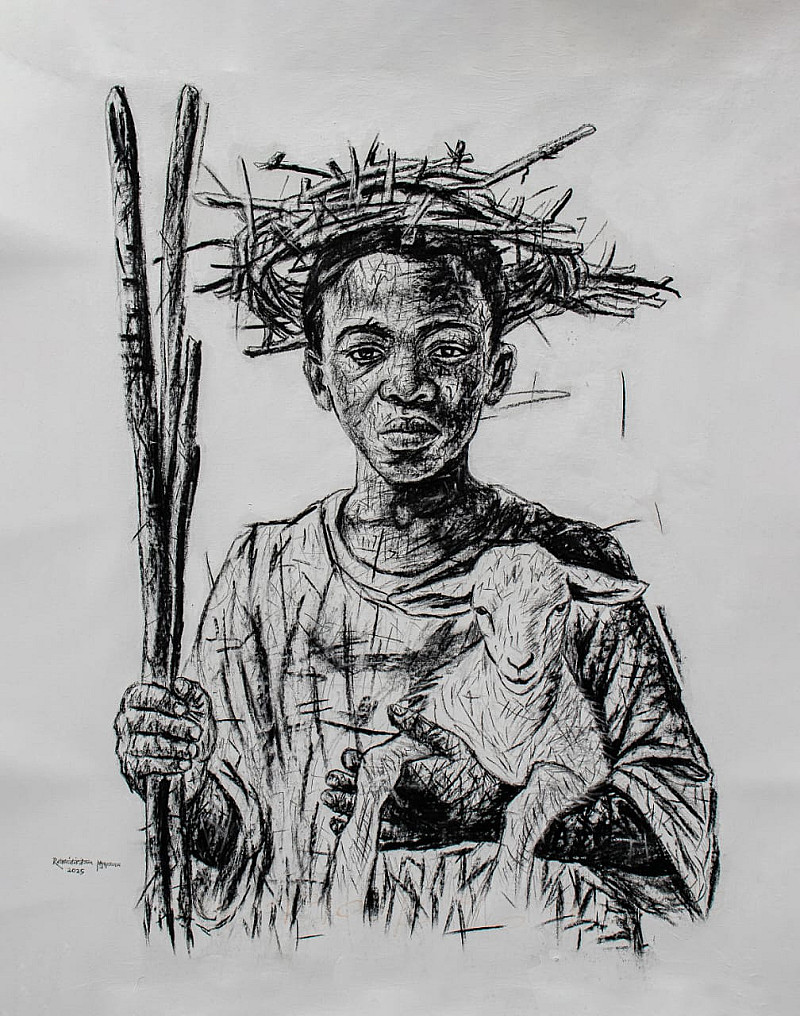 My artistic journey is deeply rooted in my Sotho heritage, spirituality, and the profound narratives that shape our identity. 'Lerato la Modisana le Ditema tsa Bophelo' translates to 'The Love of the Shepherd and the Patterns of Life,' a title that encapsulates the essence of this series. Through this body of work, I explore the spiritual and cultural connections between humanity, nature, and the unseen forces that guide us. This series is a relection of my upbringing as a shepherd , where I learned the values of patience, care, and resilience. The shepherd igure symbolizes both physical and spiritual guardianship, drawing parallels to our connection with God and the wisdom passed down by our elders. The visual language of Ditema (Sotho traditional patterns) represents the rhythm of life, our joys, struggles, and the unseen hands that shape our destiny. Using charcoal, acrylic, and mixed media, I aim to create a dialogue between realism and abstraction. The intricate patterns, textures, and layered compositions evoke a sense of history, memory, and continuity. My choice of materials mirrors the contrast between the tangible and the spiritual, allowing the viewer to navigate the visible and invisible realms. 'Lerato la Modisana le Ditema tsa Bophelo' is more than a series—it is a journey of self-discovery and healing. Through these works, I honor my past, embrace the present, and envision a future where culture and spirituality coexist harmoniously. Each piece is an invitation to relect on one’s path, guided by love, tradition, and divine purpose. Through this collection, I seek to inspire a deeper understanding of our interconnectedness—between past and present, earth and spirit, love and sacri ice. My work stands as a testimony that art is not only a visual expression but a bridge to something greater than ourselves