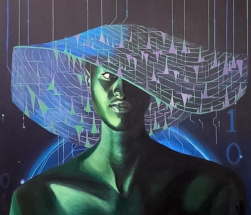 The portrait blends the organic and the artificial, showing how our identities are shaped by the digital interfaces we use daily. It illustrates the merging of physical self and digital persona, creating a complex picture of modern identity.