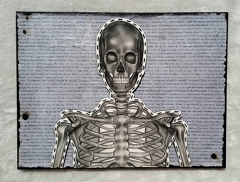 My Skeletons (2025) refers my secrets, my painful hidden secrets. The work feather features written expressions from me as the background. However the expressions are kept unclear by the tracing paper and the central skeleton. To reinforce to the point that one is crying inside. The central skeleton also point to the fact that secrets are kept to death, and also to the point that keeping painful secrets may lead to death, to skeletons that will remain unseen underground.