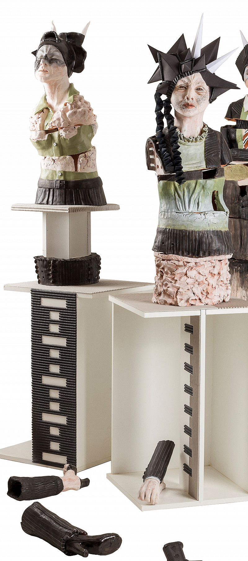 Statement on artwork: In male-dominated working environments, women aspiring to hold top leadership positions adopt stereotypical masculine leadership traits like aggressiveness, assertiveness and self-confidence. This body of work speaks to the pressure on women to fit into the male mould and the upkeep of masculine conventions. The sculptural figures are hand built from terracotta and reference the female/domestic binary. Each work is made up of segments that sit uncomfortably on each other, referring to instability, discomfort and rupture. Warrior elements embody the militant quest for dominance. The texture of the painted works further suggests the experience of rejection and distress.