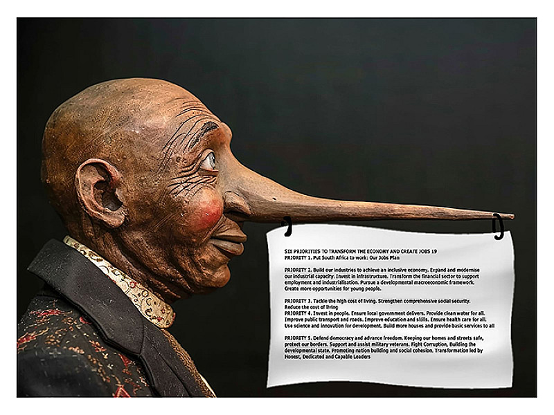 These images of the 3 major party leaders in SA at the moment, were generated by giving prompts to midjourney. Prompts were along the lines of: each leader's name, clay sculpture, facing right in profile, and Pinocchio. Roy Blumenthal assisted in this process and sent high-resolution AI generated images. These were taken into Photoshop, where the images were stretched and manipulated to create long noses onto which their manifestos could be hung. When Pinocchio told lies, his nose would grow. Our politicians are in a permanent state of nose growing exacerbated by the impending elections.The final images were presented as digital prints.