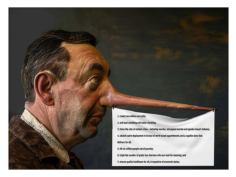 These images of the 3 major party leaders in SA at the moment, were generated by giving prompts to midjourney. Prompts were along the lines of: each leader's name, clay sculpture, facing right in profile, and Pinocchio. Roy Blumenthal assisted in this process and sent high-resolution AI generated images. These were taken into Photoshop, where the images were stretched and manipulated to create long noses onto which their manifestos could be hung. When Pinocchio told lies, his nose would grow. Our politicians are in a permanent state of nose growing exacerbated by the impending elections. The final images were presented as digital prints.