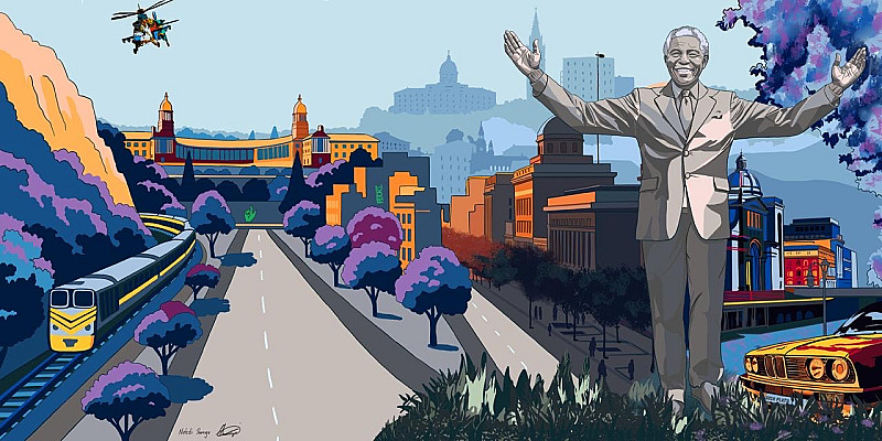 The artwork captures the city’s landscape from the towering statue of Nelson Mandela at the Union Buildings to its lively urban streets, jacaranda-lined avenues, and distant mountains. Details like the Soshanguve number plate, railway lines, and the green hand of Mamelodi Sundowns pay tribute to Pretoria’s culture, pride, and rhythm.