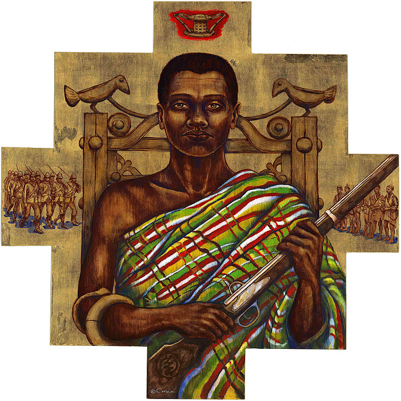 Chantal Coetzee is an artist, speaker and radio presenter, based in Cape Town. She obtained her degree in Fine Art from the University of the Witwatersrand, Johannesburg, in 1987. Since graduating, she has explored the realm of installation art in Amsterdam, street art in London, running various galleries in Cape Town, and participated in numerous exhibitions both locally and abroad. Working collaboratively with fellow artist and curator, Sharon Peers, she co-founded The Seeff Trust ArtGallery (1993-1996) and later 3RD i GALLERY (1997-2010), both in Cape Town. Coetzee’s current series of works is her on-going passion project. Painted on gold-leafed board, canvas or plywood, her large paintings are portraits of African Queens that she has meticulously researched. She celebrates their greatness and pointedly speaks to the notion of historical bias and how women’s lives and achievements have been side-lined in favour of male-centric perspectives. Expecting to discover a handful of female rulers from our continent’s past, she has been astounded to discover more than 30 (and counting) powerful women who reigned, led their armies into battle, expanded territories, fought slave traders and repelled would-be colonialists. These women are empowering role models to us all, and their stories encourage us to re-examine ourselves, our history, and our place in the world. Concurrently with the research and creation of the paintings, she is determined to share the inspiring life stories of African Queens with the public. In galleries, societies, corporate events, podcast interviews, schools and on radio, she is an enthusiastic speaker, sharing her research regarding these powerful women. Notably, she was interviewed by Prof. Thuli Madonsela on her podcast Women Ready to Lead 2030 (Nov 2022), and interviewed by Rodney Trudgeon on People of Note, Fine Music Radio March 2024. Coetzee’s African Queen artwork was exhibited in Cotonou, The Republic of Benin, in May 2023, alongside work by South African Nandipha Mntambo and Ishola Akpo of Benin. All three artists deal with women-centred issues, from different perspectives. Titled “Les femmes célèbrant la liberté dans la démocratie”, (Women Celebrating Liberty in Democracy) the expo formed part of the country’s Freedom Month