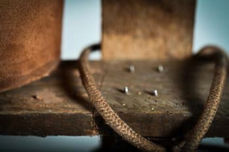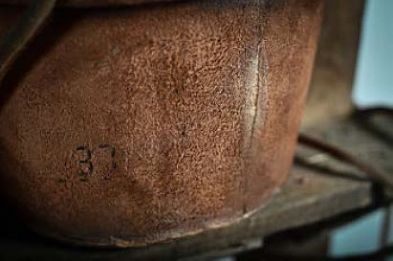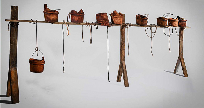 Roer, Melk Emmers/Stir, Milk Buckets consists of nine leather buckets balanced on a wooden installation and is loosely tied with rope to a horizontal wooden beam. The installation was inspired by the structures and processes used by farmers on dairy farms when feeding milk to the calves who reside in small stalls away from their mothers. The milk of the cows is poured/squeezed into plastic buckets which is then fed to the calves just outside of their stalls and placed upside down on a wooden structure/beam to rid of any excess milk and prevent it from going sour.