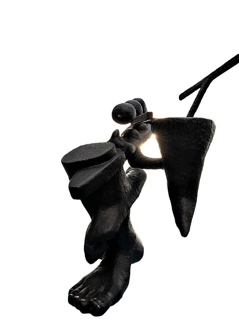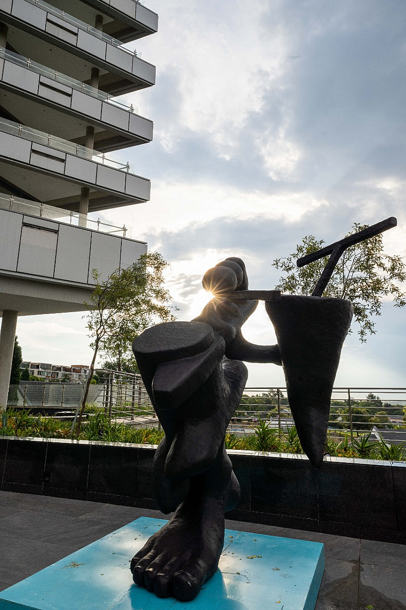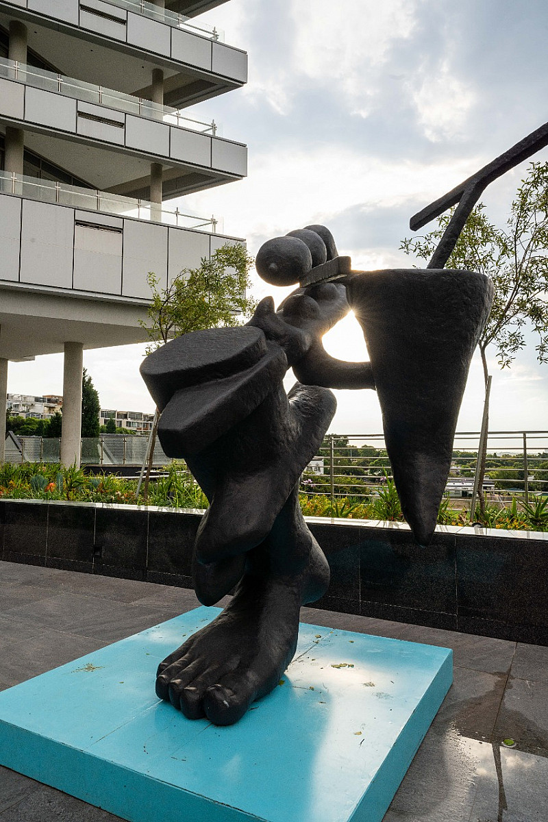For the last two years the sculpture was located in Maboneng CBD, Johannesburg. At the end of 2020 it was vandalised by individuals that illegally took over the building. The vandals ripped the sculpture out of the ground and hacked pieces off the metal cage and destroyed the fibreglass base. I decide to collaborate with the vandals and take into consideration what they did to the artwork. They destroyed the cage that anchored the artwork as well as the tiered wedding cake base. I took that as their decision as part of this collaboration and de-cided not recreated the base or cage but rather make another metal base. I also painted the whole sculpture black and left out the previously painted navy blue section.