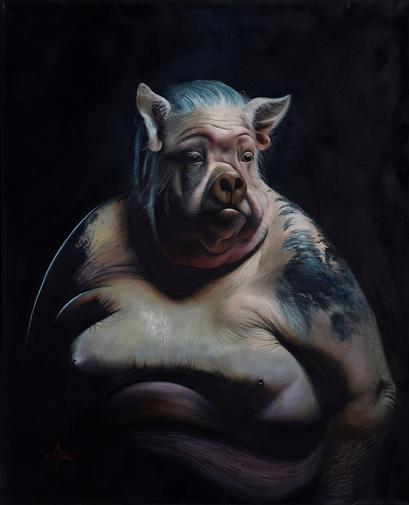 A primal figure, half-animal, half-human, rooted in the earth. She carries a mirror to humanity, urging us to confront our inner animal nature.