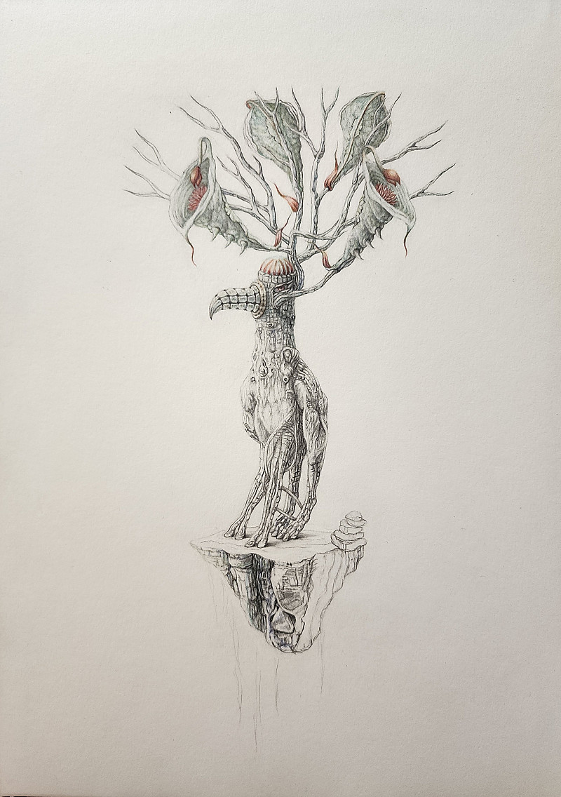 In a world where nature is no longer left to its own design. This piece explores the beauty within a dystopia where flora intertwines with beast and machine forming a hybrid entity that defies natural classification. It challenges the ethics of genetic interference, raising questions about survival, identity and consequence.