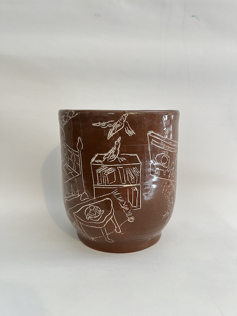 In Impressions Across Distance / The Space Between, my practice moves between clay and watercolour, between permanence and dissolution. The ceramic vessels carry etched fragments—ducks in flight, gates ajar, facades half‑remembered—like whispers of memory pressed into earth. They are containers of story, holding the fragile balance between what is lost and what endures.