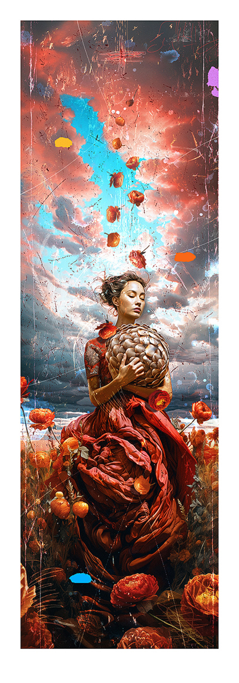It is important to know that only a part of my images are created with AI, the most work still happens afterwards in Photoshop. The AI can never exactly do what I have in mind. Especially the marks and the decisions made with the small colour areas and especially the marks over the final images. Also, I am loving this because it is a brand new tool, but am already conceptualising new linocuts. Although I embrace new media and new possibilities, I will always return to classical printmaking. I actually already am planning a combination of lino and digital prints, but for now, I am loving this new tool!