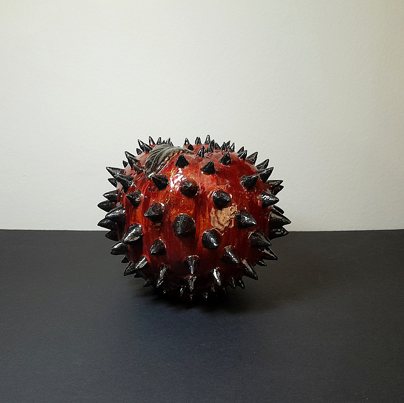 This work depicts an apple (the classic fruit used to depict the fruit from the tree of knowledge of good and evil.) cover by protruding thorns. The work represents ignorance and knowledge and how both can be sought after and attractive - ignorance is bliss, knowledge is power.) and yet both can be damaging. Knowing too much can sometimes be dangerous and a disadvantage. Whereas ignorance may bring a freedom from responsibility and sense of peace, yet ignorance can also be dangerous and misinformation and propaganda is also a form of false knowledge or ignorance.