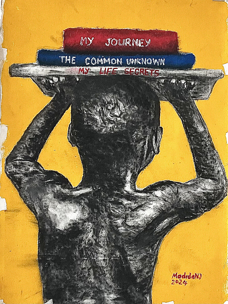 Description: The piece of art deeply examines the hidden weights borne throughout life, illustrated by the depiction of a young child holding a pile of books over their head. The child's robust, dark skin stands out against a bright yellow backdrop, highlighting both the burden they carry and the strength needed to sustain it. Every book has a unique title: “MY JOURNEY,” “THE COMMON UNKNOWN,” and “MY LIFE SECRETS,” encouraging contemplation of the personal experiences, obstacles, and insights that define one's identity.