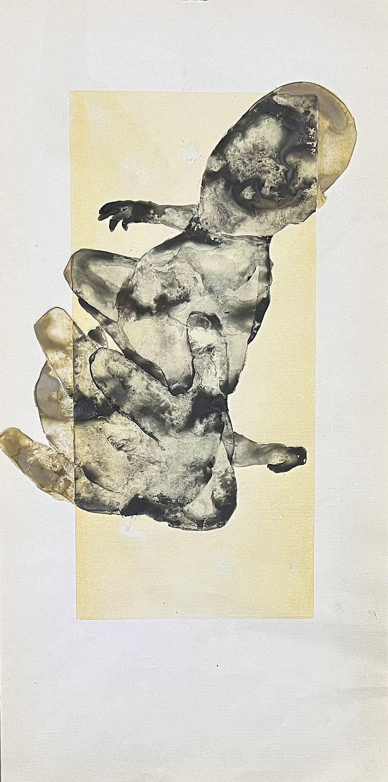 In my exploration of printmaking, I expand into the alchemical transformation of materials, where the act of burning lino and layering with gouache washes becomes a dialogue with the divine and the mundane. This process speaks to the unassuming nature of elements that I’ve seen and experienced, creating a platform which invites viewers to engage with the unconventional and the transformative coincidences in their lives. Central to my work is the figure of a man leaping forward, reminiscent of the divine touch between God and Adam, yet viewed from a perspective that challenges traditional narratives. Surrounding this figure, cows and spiders emerge as symbolic elements, embodying the powerful oneroi - dream spirits - that guide my exploration of existential themes. Through the morphing of mediums, I invoke Morpheus, the god of dreams, and weave in the story of Anansi, the trickster spider, to reflect on the trajectory of calamity and transformation in my own life. The burning, printing, and painting processes are points of inquisition, echoing the eternal nature of fire through which the origins of the psyche were born. In the myth of Prometheus, fire was gifted to humanity, symbolising the dawn of knowledge and the complexities of human consciousness. Furthermore, drawing from Jungian psychology, the cow represents the animus, a bridge to the unconscious, while the spider symbolises the shadow, the hidden aspects of the self. The figure in the artwork embodies the unconscious, a realm of untapped potential and mystery. Jung's concept of the collective unconscious suggests that these symbols resonate universally, connecting individual experiences to shared human heritage. Through my art, I aim to illuminate the perpetual dance between creation and destruction, inviting viewers to explore the infinite questions that fire inspires within the conscious and unconscious mind.