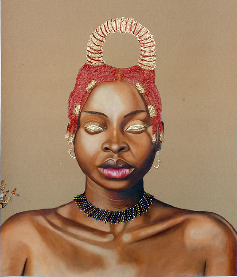 , Samantha Maseko , Oil paint, Gold dust, Beads & Collage on Brown Paper