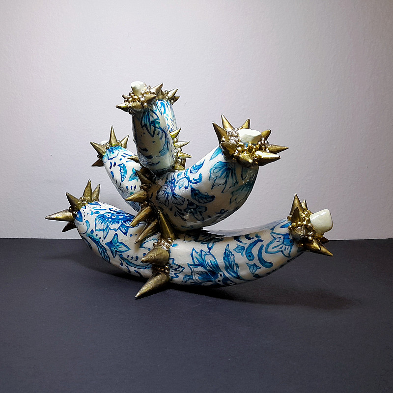 The work represents tradition and cultural identity ( the Delft blue pattern which is so prevalent in many cultures and history) traditions and history can be an important part of our identity as individuals and as communities and yet following tradition blindly can be very damaging and detrimental. The bananas stacked on top of eachother represent the generations which traditions have been built upon, the colour of the golden spikes can be seen as generational wealth accumulated and the form of the spikes the aspect of deadlines and harm of being too set on old ways and traditions in an ever changing world.