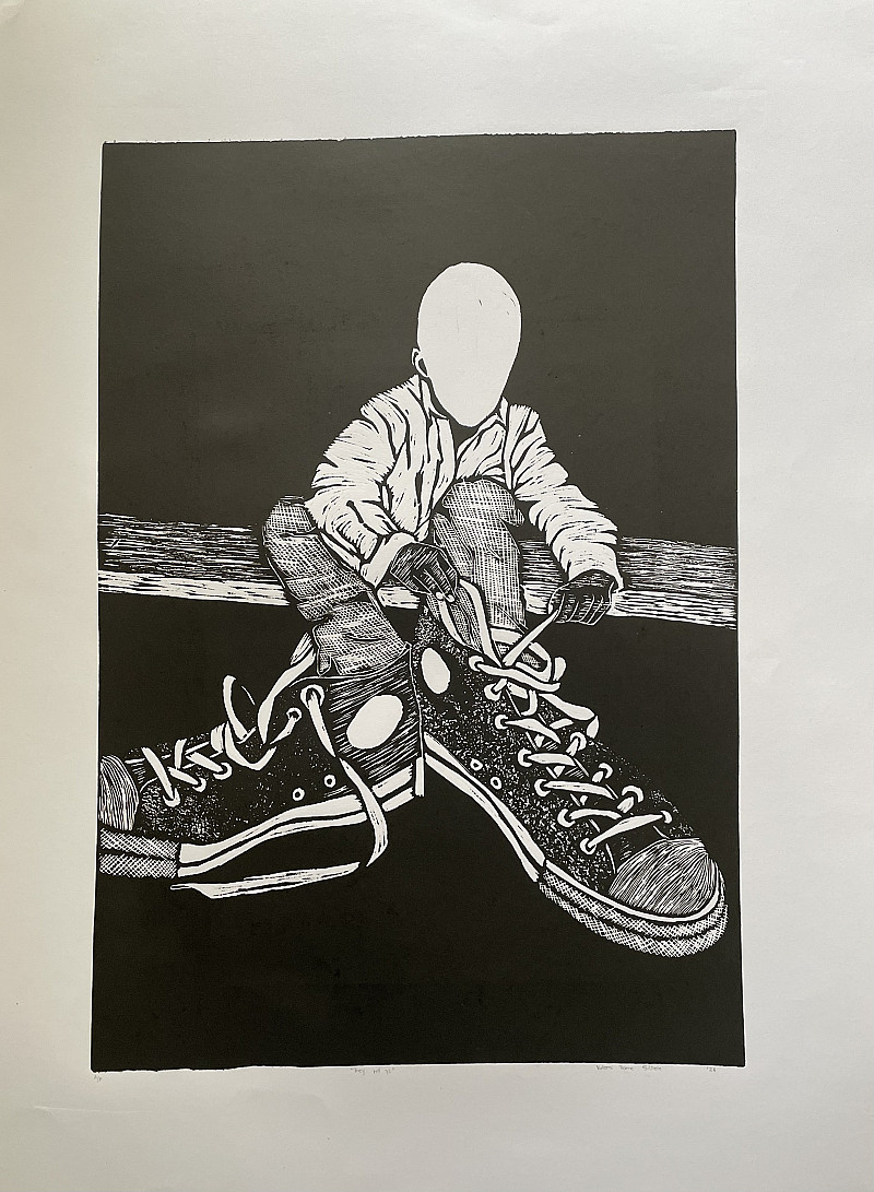 Scapes is an exploration of escape, not as running away, but as a quiet journey toward freedom, transformation, and self-discovery. Through black and white prints, a painting, and a charcoal drawing, the works trace the paths we walk, the weight we carry, and the marks left by endurance. Some feet are protected, others exposed; some bear the scars of hardship, while others reach toward what is yet to come.