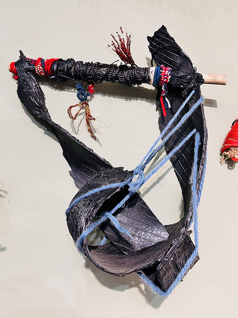 My artistic practice explores the intersections of memory, materiality, and transformation, engaging with themes of resilience, spirituality, and environmental consciousness. Working primarily with discarded and industrial materials—such as shredded tyre strips, metallic wires, and woven strings—I construct sculptural forms that embody tension, endurance, and renewal. These materials, often overlooked or deemed obsolete, become conduits for storytelling, symbolizing both the fragility and tenacity of existence.