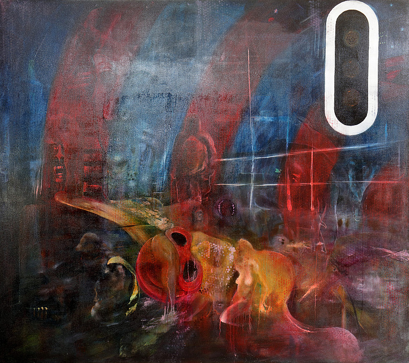 A splash of color from the end of the world. A step into half-seen faces, indistinct scenes, signals—red and blue waves pulsing like a Wi-Fi symbol or a pendulum keeping time for the indecisive apocalypse. It’s okay. Everything will be okay in the end, and if it’s not okay, it’s not the end.