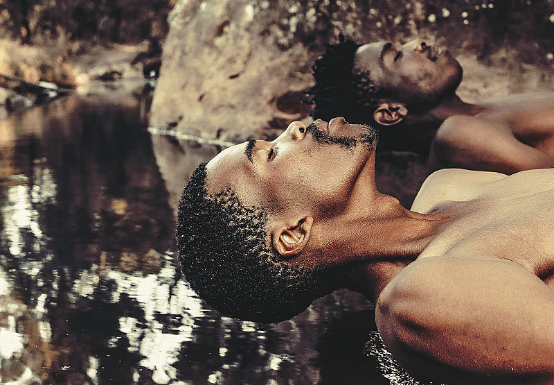 This photograph shows two men who share a connection of harmony through calmness. There is a profound sense of unity as men try to find tranquility as means to heal their vulnerability and hurt. This artwork shows a profound sense of unity or tranquility found in moments of reflection.
