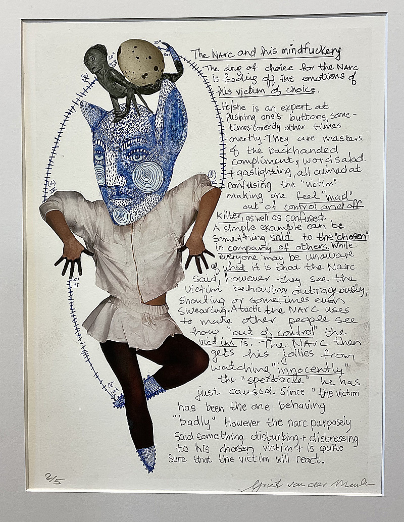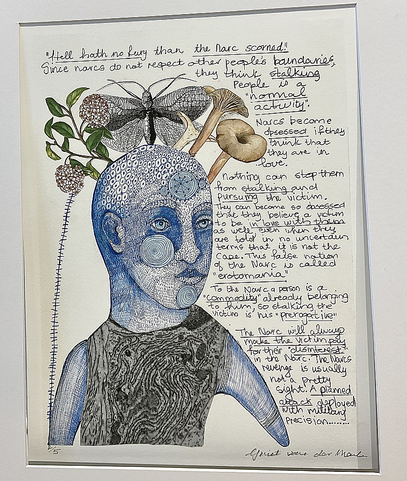 The piece “Votives for the Damaged, or Identifying a Narcissist” includes notes and reflections on recognising and identifying abusers. Healing often begins with the ability to acknowledge that abuse has taken place. Once this recognition occurs, the healing process can begin—requiring the victim to understand how abusers operate and how to break the cycle of abuse.